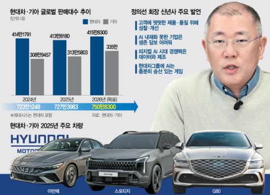 지난해 글로벌 판매는 현대차 413만 8180대, 기아 313만 5803대 등 727만 3983대를 기록했다. 목표치(739만 대)에는 미치지 못했지만 미국 관세 등 불확실성이 커진 여건을 감안하면 준수한 성적이라는 평가다. 기아는 판매를 2% 늘리며 역대 최고 실적을 냈고 현대차는 0.1% 감소했다.