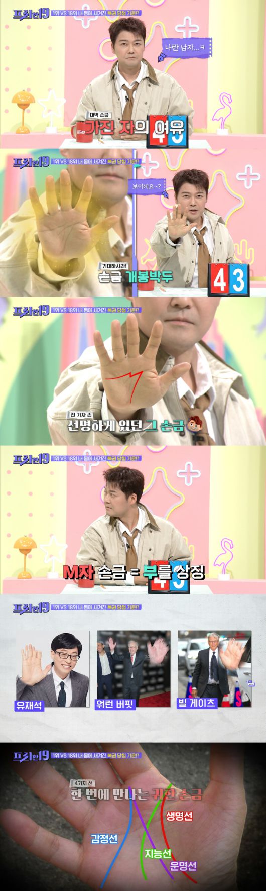또한 그는 "돈을 마술처럼 끌어당길 정도로 금전운이 강하다"며 "실제로 복권 477회, 501회 당첨자들의 손에서도 M자 손금이 발견됐다"고 부연해 흥미를 더했다.