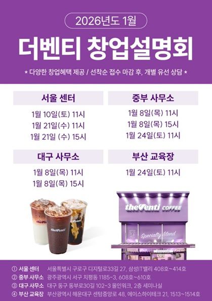 더벤티 관계자는 “2026년에도 예비 창업자들에게 실질적인 지원과 정보를 제공하기 위해 전국 4개 도시에서 창업설명회를 개최하게 되었다”며 “올해 카페 창업을 준비하는 예비창업자들에게 창업에 필요한 정보와 더벤티만의 차별화된 지원 정책을 직접 확인할 수 있는 기회가 될 것이다”고 말했다.