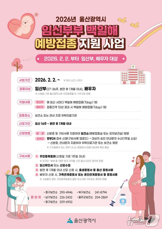 (울산=뉴스1) 조민주 기자 = 울산시는 올해부터 임산부와 배우자를 대상으로 무료 백일해 예방접종 지원 사업을 시행한다고 6일 밝혔다.