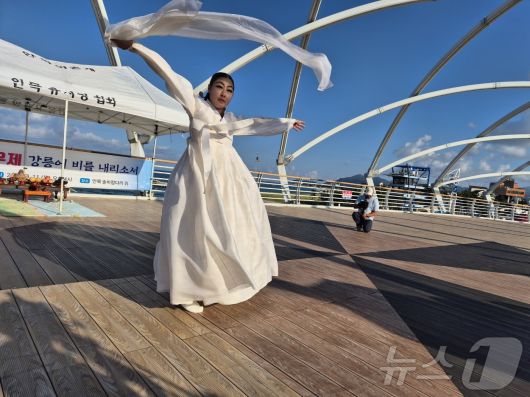 최근 극심한 가뭄을 겪고 있는 강원 강릉 병산동 남항진 솔바람다리에서 11일 안목어촌계가 주관한 용신기우제가 열리고 있다. 용굿이라도 불리는 용신기우제는 강릉지역에서 예년부터 가뭄이 들면 하던 전통 민속 신앙 행사다. 가뭄으로 재난사태가 선포된 강릉의 이날 주 취수원 저수율은 11.8%로 전날 12%보다 0.25%p 떨어졌다. 2025.9.11/뉴스1 ⓒ News1 윤왕근 기자 |