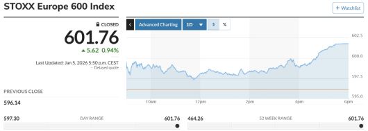 유럽증시는 5일(현지시간) 베네수엘라 사태 전개에 주목하는 투자자들의 움직임 속에 사상 최고치를 찍었다.
