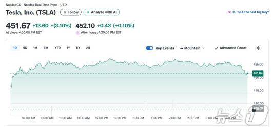 5일(현지 시각) 뉴욕증시에서 테슬라는 3.10% 급등한 451.67달러를 기록했다. 이로써 시총도 1조5000억달러를 돌파한 1조5020억달러로 집계됐다.