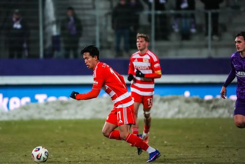 드리블하는 우니온 베를린의 공격수 정우영 |
