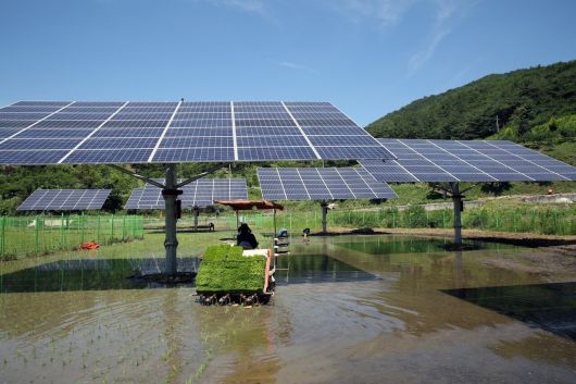 논에 설치된 영농형 태양광 설비 아래에서 농작업이 진행되고 있다. 영농형 태양광은 농작물 재배와 태양광 발전을 병행하는 방식으로, 농지의 본래 기능을 유지하면서 재생에너지를 생산할 수 있는 것이 특징이다. 작물 생육에 필요한 일조량을 고려해 태양광 패널의 높이와 간격을 조절함으로써 벼 재배 등 기존 농업 활동이 가능하다. 농가 소득 다변화와 탄소중립 실현을 동시에 기대할 수 있는 대안으로 주목받고 있다. (사진=파루솔라) |