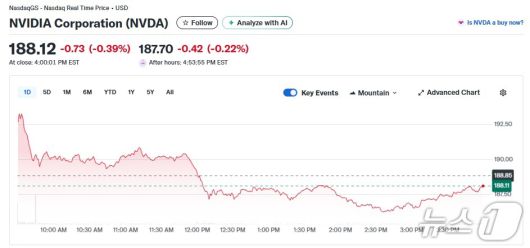 5일(현지 시각) 뉴욕증시에서 엔비디아는 0.39% 하락한 188.12달러로 장을 마감했다. 장 마감 후 시간외거래에서도 0.22% 하락하고 있다.