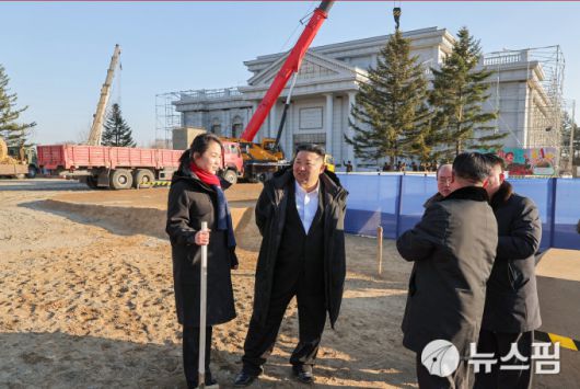 [서울=뉴스핌] 이영종 통일전문기자 = 북한 국무위원장 김정은이 5일 우크라이나전에 투입됐다 전사한 군인들을 추모하기 위한 시설인 '해외 군사작전 전투위훈기념관' 건선 현장을 방문했다. 사진은 딸 주애와 함께 간부들과 이야기를 나누는 모습. [사진=노동신문] 2026.01.06 yjlee@newspim.com |