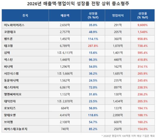 매출액에 차이는 있지만 올해 영업이익 성장률이 가장 높을 것으로 예상된 중소형주는 이노와이어리스로 영업이익 전망치는 291억원, 전년대비 9600% 폭증할 것으로 예상됐다. 또한 코윈테크와 펨트론은 올해 영업이익이 각각 205억원, 360억원으로 전망되면서 영업이익 성장률이 1540%, 960% 급증할 것으로 관측된다. 테크윙의 경우 영업이익(1878억원)이 전년과 비교해 700% 폭증할 것이란 전망과 함께 매출액(6789억원)도 전년대비 300% 가까이 급증할 것으로 예상돼 중소형주 중 가장 높은 수준의 매출액 성장률이 예상됐다. 넥스틴과 비나텍도 영업이익이 각각 400%, 300% 이상 비약적인 성장세를 기록할 것이란 관측이다.