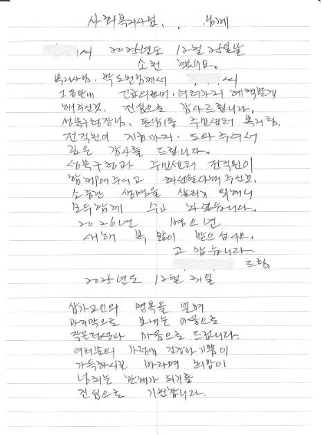 비록 배우자는 긴 투병 끝에 세상을 떠났지만 A씨는 편지를 통해 “함께해 주시고 최선을 다해 주신 것, 소중한 생명을 살리기 위해서 모두 함께 수고하셨다”며 지난 수개월간 자신의 가족을 위해 헌신해 준 복지 담당자들에게 깊은 고마움을 표했다.