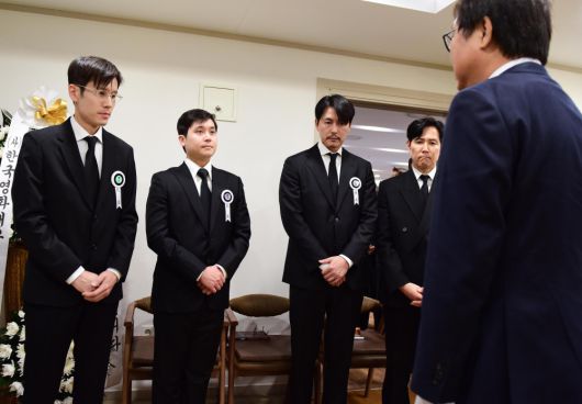 최휘영 문화체육관광부 장관이 5일 별세한 배우 안성기의 서울성모병원 빈소를 조문하고 있다. 왼쪽은 고인의 아들들, 오른쪽은 배우 정우성과 이정재. |