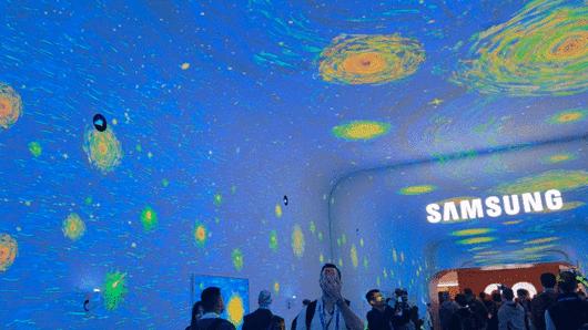 4일(현지시간) 미국 라스베이거스 윈 호텔에서 열린 ‘삼성 퍼스트 룩’ 전시관의 입구인 ‘AI 갤러리’에 고흐의 그림이 흐르고 있다. [사진=박지은 기자] |