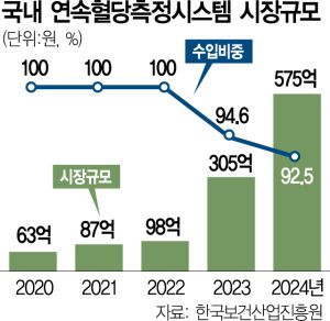 연속혈당측정시스템(CGM)이 약 575억 원 규모로 급성장했지만 국산 점유율은 7.5%로 한 자릿수에 그쳐 국산화가 시급하다. 국산 제품의 성능이 가격에 비해 외산에 크게 뒤지지 않는 만큼 의료기관이 보다 적극적으로 환자에게 권고하고, 업계도 제품 다양화와 공격적인 마케팅에 나설 필요가 있다는 지적이 나온다.