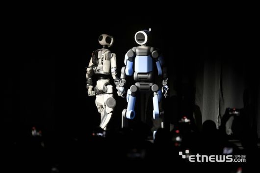 세계 최대 가전·정보기술(IT) 전시회 'CES 2026' 개막을 하루 앞둔 5일(현지시간) 미국 네바다주 라스베이거스 만달레이베이에서 열린 현대차그룹 프레스 컨퍼런스에서 차세대 전동식 아틀라스 시제품(왼쪽)과 아틀라스 개발형 모델이 무대에 공개돼 있다. 라스베이거스=이동근기자 foto@etnews.com |