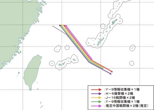 일본 방위성 통합막료감부에 따르면 중국군 폭격기 2대, 전투기 2대, 정보수집기 2대와 중국군 전투기로 추정되는 항공기 2대는 작년 12월 29일 오후 동남쪽으로 비행해 오키나와현 섬들 사이 상공을 지난 뒤 거의 같은 경로를 통해 돌아갔다.
