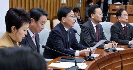 송언석 국민의힘 원내대표가 6일 국회에서 열린 원내대책회의에서 발언하고 있다.