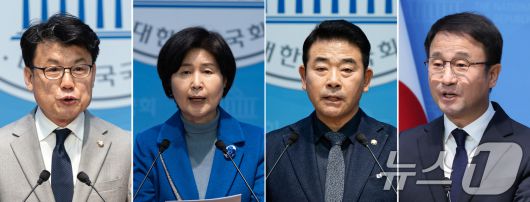 오는 11일 치러지는 더불어민주당 원내대표 보궐선거에 3선 의원 4파전 구도가 윤곽이 드러났다. 사진 왼쪽부터 출마를 선언한 진성준, 백혜련, 박정, 한병도 의원. 2026.1.4/뉴스1 ⓒ News1 신웅수 기자 |