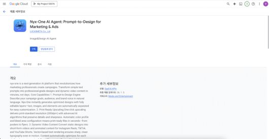 마켓플레이스에 등재된 제품명은 ‘마케팅 및 광고를 위한 닉스원 AI 에이전트(Nyx-One AI Agent: Prompt-to-Design for Marketing & Ads)’다. 해당 솔루션은 마케팅과 광고 분야에 특화되어 있으며, 사용자가 텍스트를 입력하면 기업의 톤앤매너에 맞춘 디자인 결과물을 생성하는 기능을 제공한다.