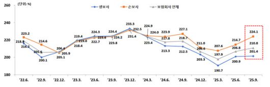보험사별로는 생보사인 삼성생명(192.7%)과 교보생명(205.2%)의 지급 여력 비율이 6%포인트 오른 반면, 한화생명(158.2%)과 신한라이프(189.7%)는 각각 2.4%포인트, 9.9%포인트 떨어졌다. 손보사의 경우 삼성화재(275.9%), DB손보(226.5%), 현대해상(179.8%), 메리츠화재(243.7%) 지급 여력 비율이 증가했지만, KB손보(191.2%)는 0.3%포인트 하락했다. 최근 적기 시정 조치인 경영 개선 권고를 받은 롯데손보는 12.5%포인트 올라 142%를 기록했다.