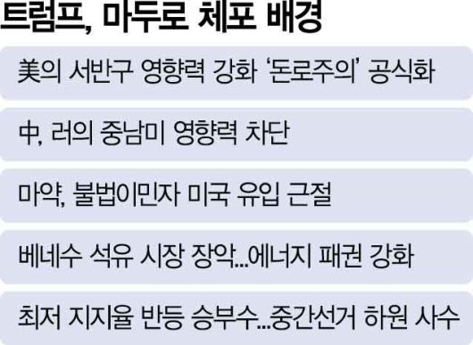 마두로 대통령 축출로 중남미 정세가 어지러워지면서 지정학적 불안정성이 고조돼 주가와 유가 변동성도 당분간 커질 것으로 보인다. 미국 중간선거가 가까워질수록 트럼프 대통령이 아메리카 대륙 패권주의 행보에 속도를 낼 수 있다는 점도 금융시장의 중대 변수가 될 전망이다.
