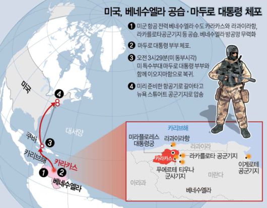 마두로 대통령은 이날 미군 해병대가 운용하는 강습상륙함 ‘이오지마함’을 타고 미국 뉴욕으로 압송당했다. 마두로 대통령이 마약 혐의로 기소된 곳이 뉴욕 연방법원이기 때문이었다. 미국은 트럼프 행정부 1기 때인 2020년 3월 마약 밀매와 돈세탁 등의 혐의로 마두로 대통령을 기소한 바 있다. 트럼프 대통령은 폭스뉴스 인터뷰에서 이번 군사작전에서 사망한 미국인은 없었다며 “우리는 그것(베네수엘라의 미래)에 매우 많이 개입할 것”이라고 밝혔다.