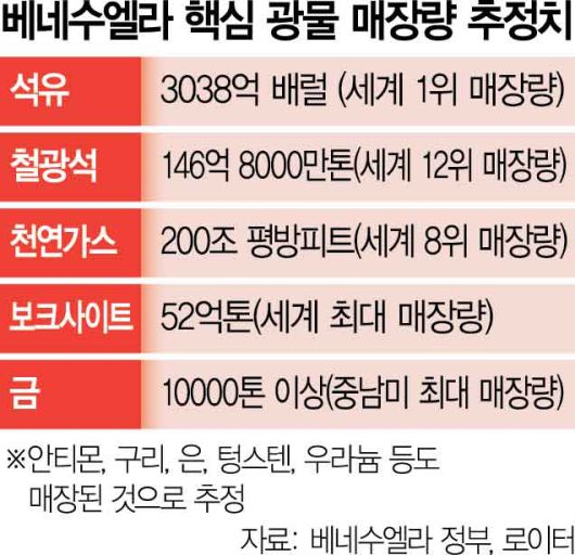월가의 눈은 트럼프 대통령이 눈독들이는 베네수엘라의 원유에 쏠렸다. 베네수엘라가 자체적으로 판단하는 원유 매장량은 3000억 배럴 이상이다. 잠재성만 놓고 보면 사우디아라비아를 제치고 세계 1위 원유 매장 국가라는 평가도 있다. 부실한 석유 기반 시설과 미국의 제재 탓에 현 원유 생산량은 하루 100만 배럴 수준이다. 이는 전 세계 원유 생산량의 1%에 불과한 수치다.