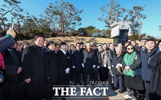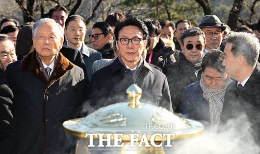 김민석 국무총리(가운데)가 6일 오전 서울 동작구 국립서울현충원 김대중 대통령 묘소에서 열린 김대중재단 신년하례에 참석해 참배를 마친 뒤 묘소를 바라보고 있다. /임영무 기자 |