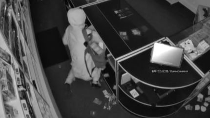 유리문 아래쪽을 도구로 내려치고 손으로 잡아 뜯더니, 가게 안으로 기어 들어오는 두 사람,