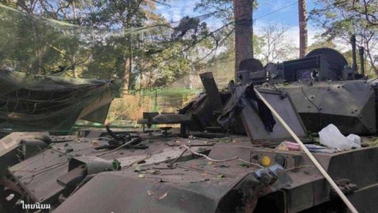태국과 캄보디아 간 무력 충돌 과정에서 포신이 폭발한 중국산 VT-4 전차. 소셜미디어 캡처 |