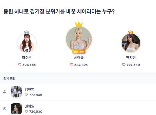 2위는 이주은으로 80만3355표를 얻었다. 밝은 이미지와 안정적인 퍼포먼스로 꾸준한 지지를 받아온 그는 경기장 안팎에서 변함없는 존재감을 이어가고 있다.