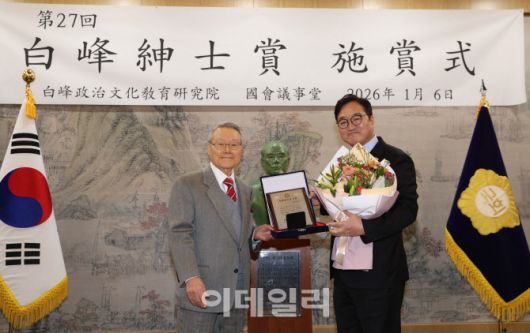 [이데일리 노진환 기자] 우원식 국회의장이 6일 서울 여의도 국회에서 열린 백봉 신사상 시상식에서 대상을 수상하고 있다. 왼쪽은 라종일 백봉정치문화교육연구원 이사장.