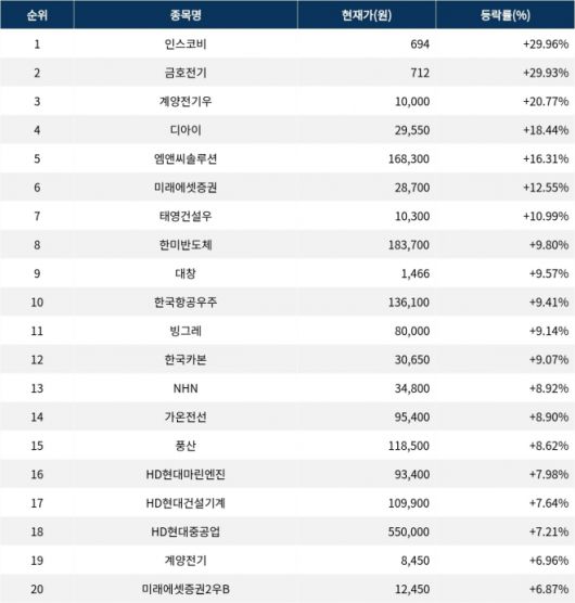 이밖에도 빙그레(005180) ▲9.14%, 한국카본(017960) ▲9.07%, NHN(181710) ▲8.92%, 가온전선(000500) ▲8.90% 등을 기록하며 금일 증시를 상승으로 마감했다.