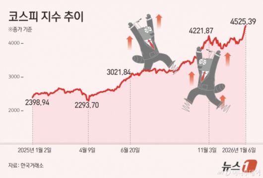 [서울=뉴시스] 정병혁 기자 = 코스피가 사상 처음으로 4500선을 넘긴 6일 서울 영등포구 한국거래소 전광판에 지수가 표시되어 있다. 이날 코스피는 전 거래일(4457.52) 보다 67.96포인트(1.52%) 오른 4525.48에, 코스닥 지수는 전 거래일(957.50) 보다 1.53포인트(0.16%) 내린 955.97에 장을 마쳤다. 서울 외환시장에서 원·달러 환율은 전 거래일 주간거래 종가(1443.8)보다 1.7원 오른 1445.5원에 마감했다. 2026.01.06. jhope@newsis.com /사진=정병혁 |