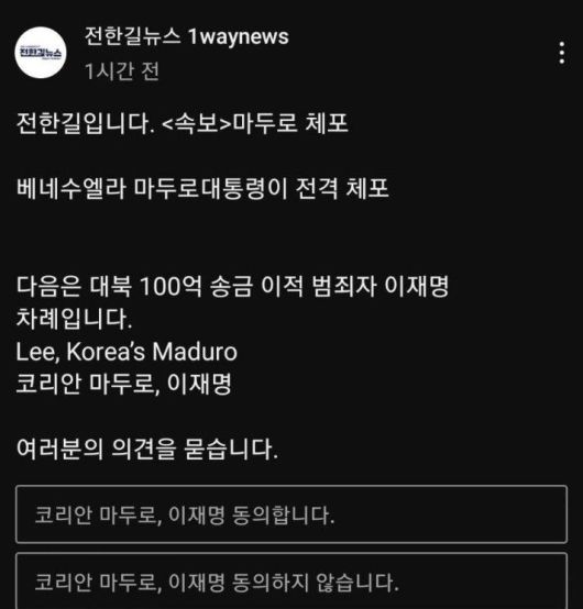 5일 전한길은 자신의 유튜브 채널 커뮤니티를 통해 "베네수엘라 마두로 대통령이 전격 체포됐다"며 이같이 밝혔다.