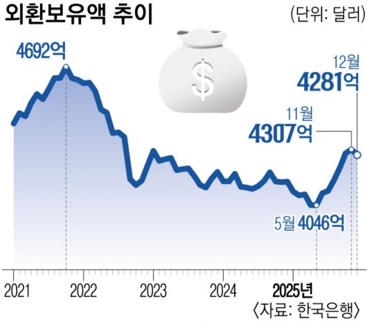한국은행이 6일 발표한 ‘2025년 12월 말 외환보유액’에 따르면 지난달 말 기준 한국의 외환보유액은 4280억 5000만 달러(약 618조원)로 전월(4306억 6000만 달러)보다 약 26억 달러 감소했다. 1997년 12월 기록한 40억 달러 감소 이후 28년 만에 최대치로, 역대 두 번째로 큰 감소 폭이다.