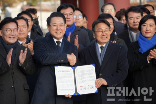 ▲2일 오전 광주 북구 운정동 국립 5·18민주묘지 민주의 문 앞에서 김영록 전라남도지사(왼쪽)와 강기정 광주광역시장(오른쪽)이 '광주·전남 대통합 추진문'을 들고 기념사진을 찍고 있다.2026.01.02ⓒ프레시안(김보현) |