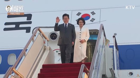중국을 국빈 방문 중인 이재명 대통령이 6일 오후 김혜경 여사와 함께 상하이 푸동 국제공항에 도착해 인사하고 있다. [사진=KTV] |