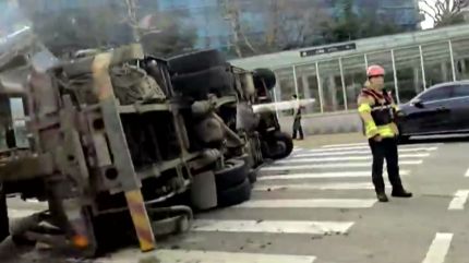 시내버스 앞부분이 완전히 찌그러져 내부가 훤히 들여다보이고, 커다란 화물차는 옆으로 쓰러져 있습니다.