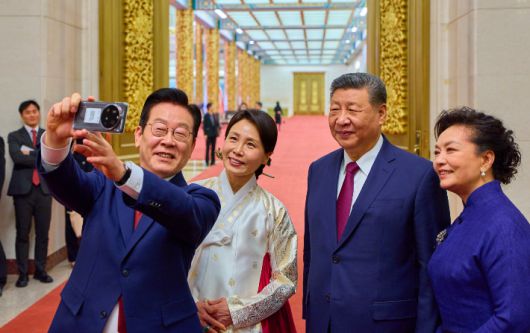 이재명 대통령 부부와 시진핑 국가주석 부부가 5일 중국 베이징 인민대회당에서 국빈만찬 후 샤오미폰으로 기념촬영을 하고 있다. 이 샤오미폰은 경주 정상회담 때 시 주석이 이 대통령에게 선물한 것이다. 연합뉴스 |