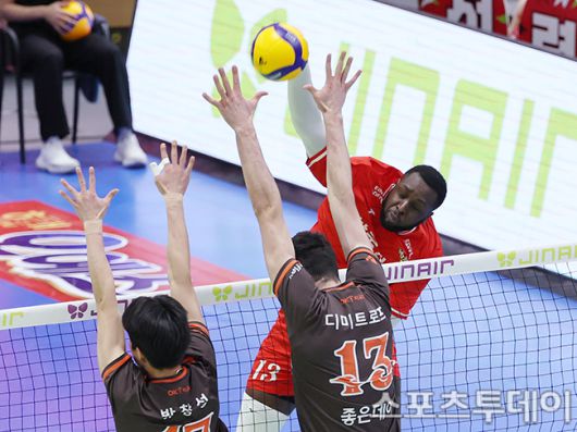 [수원(경기)=스포츠투데이 권광일 기자] 2025-2026 진에어 V-리그 남자부 한국전력-OK저축흔행 경기가 6일 경기 수원시 수원체육관에서 열렸다. 한국전력 베논이 스파이크를 때리고 있다. 2026.01.06. [스포츠투데이 권광일 기자 sports@stoo.com]