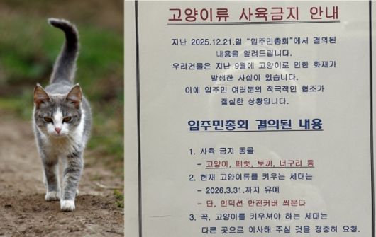 이에 따르면 해당 입주민총회에서는 고양이, 토끼, 너구리 등의 사육을 금지하기로 결정했으며, 기존 고양이 사육 세대의 경우 2026년 3월 말까지 유예 기간을 두되 화재 예방을 위한 인덕션 안전커버 설치가 의무화된다. 그러면서 공지문은 "꼭 고양이를 키워야 하는 세대는 다른 곳으로 이사해 줄 것을 정중히 요청한다"고 돼 있다.