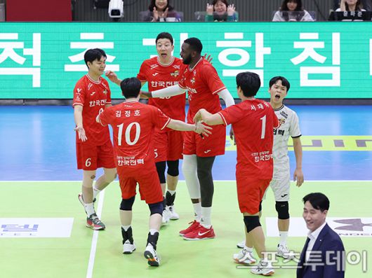 [수원(경기)=스포츠투데이 권광일 기자] 2025-2026 진에어 V-리그 남자부 한국전력-OK저축흔행 경기가 6일 경기 수원시 수원체육관에서 열렸다. 한국전력이 OK저축은행을 상대로 세트스코어 3-1 승리를 하고 있다. 2026.01.06. [스포츠투데이 권광일 기자 sports@stoo.com]