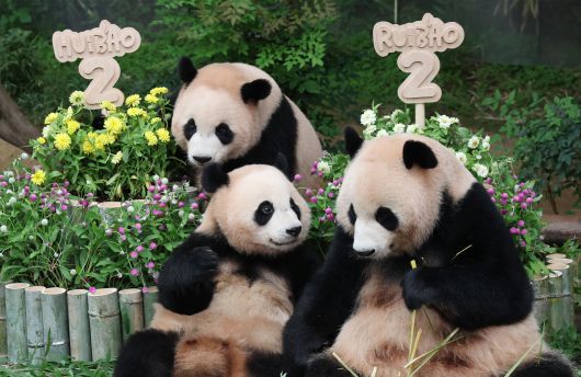 경기 용인시 처인구 에버랜드 판다월드에서 엄마 아이바오와 쌍둥이 아기판다 루이바오·후이바오가 두돌 생일을 맞아 먹이를 먹고 있다./한국사진기자협회 경기지회 제공 |