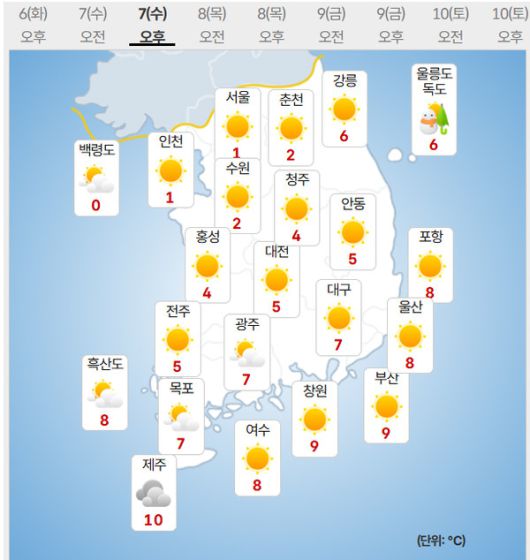 내일(7일) 아침최저기온은 -5~3℃, 낮최고기온은 0~10℃가 되겠다.