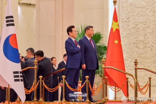 [서울=뉴스핌] 이재명 대통령이 지난 5일 중국 베이징 인민대회당에서 시진핑(習近平) 중국 국가주석과 정상회담을 진행했다. 정상회담에 앞서 열린 환영 행사에서 이재명 대통령이 국기에 대한 경례를 하고 있다. [사진=청와대] 2026.01.06 photo@newspim.com