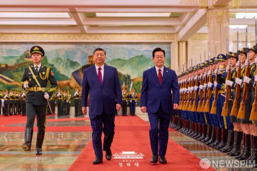[서울=뉴스핌] 이재명 대통령이 지난 5일 중국 베이징 인민대회당에서 시진핑(習近平) 중국 국가주석과 정상회담을 진행했다. 정상회담에 앞서 열린 환영 행사에서 이재명 대통령과 시진핑 주석이 의장대를 사열하고 있다. [사진=청와대] 2026.01.06 photo@newspim.com