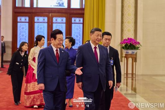 [서울=뉴스핌] 이재명 대통령이 지난 5일 중국 베이징 인민대회당에서 시진핑(習近平) 중국 국가주석과 정상회담을 위해 이동하고 있다. [사진=청와대] 2026.01.06 photo@newspim.com
