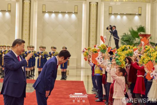 [서울=뉴스핌] 이재명 대통령이 지난 5일 중국 베이징 인민대회당에서 시진핑(習近平) 중국 국가주석과 정상회담을 위해 이동하며 아이들을 향해 허리숙여 인사하고 있다. [사진=청와대] 2026.01.06 photo@newspim.com |