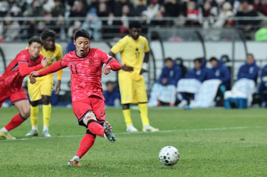 한국 축구 대표팀 황희찬이 슈팅한다 |
