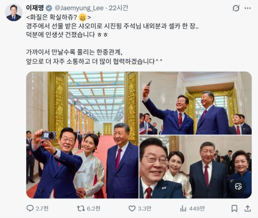 "화질은 확실하쥬? 경주에서 선물 받은 샤오미로 시진핑 주석님 내외분과 셀카 한 장. 덕분에 인생샷 건졌습니다 ㅎㅎ" "가까이서 만날수록 풀리는 한중관계, 앞으로 더 자주 소통하고 더 많이 협력하겠습니다^^"