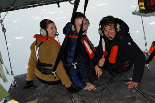 [누크=AP/뉴시스] 에마뉘엘 마크롱(오른쪽) 프랑스 대통령이 15일(현지시간) 메테 프레데릭센(왼쪽) 덴마크 총리, 옌스 프레데릭 닐슨 그린란드 총리와 함께 헬기에 탑승해 그린란드를 둘러보고 있다. 마크롱 대통령은 덴마크 자치령 그린란드를 찾아 "그린란드는 매물도 아니고 강제로 뺏을 수 있는 곳도 아니다"라고 밝혔다. 2025.06.16 |